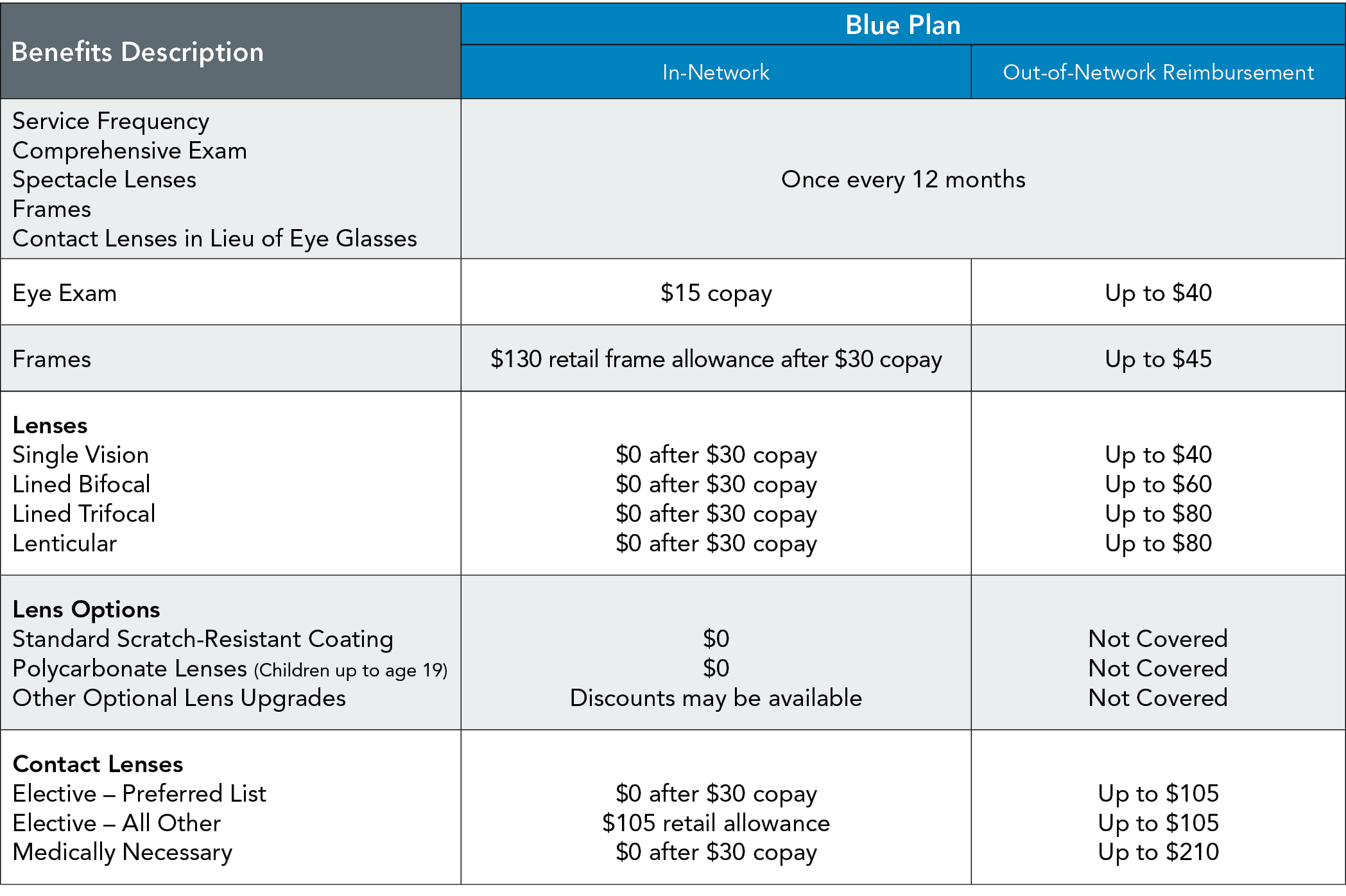 The chart below lists the benefits provided under the Carrier Vision Plan.